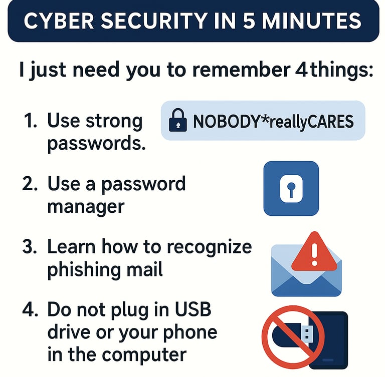 You have 5 minutes to educate new crew member about cyber security. How would you go about it?